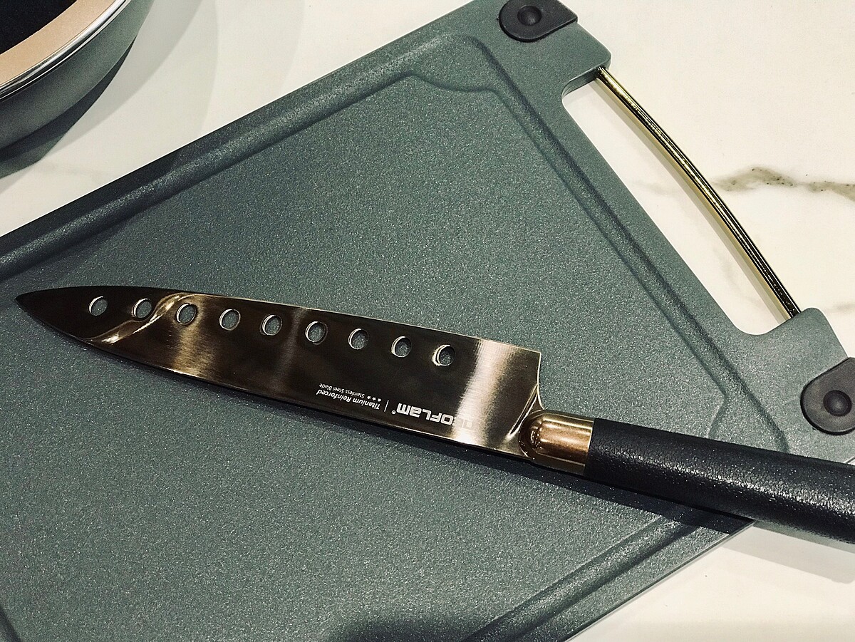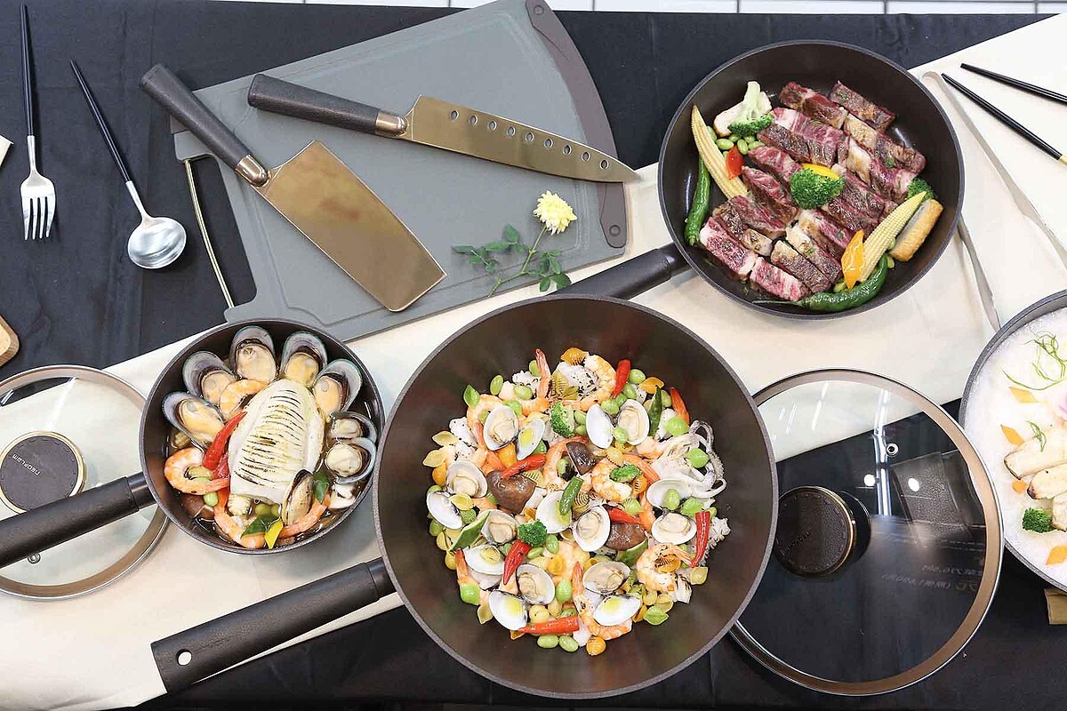 外觀設計上,《大貴鏃》鍋具採用古董馬鞍針縫法的皮革質感,結合奢華感十足玫瑰金配色金屬,從手柄、旋鈕的優雅手作質感,到「XTREMA幻瓷技術」奈米塗層細緻紋路,加上《大貴鏃》系列玫瑰金鈦金刀具、極簡黑抗菌砧板,既時髦又優雅。