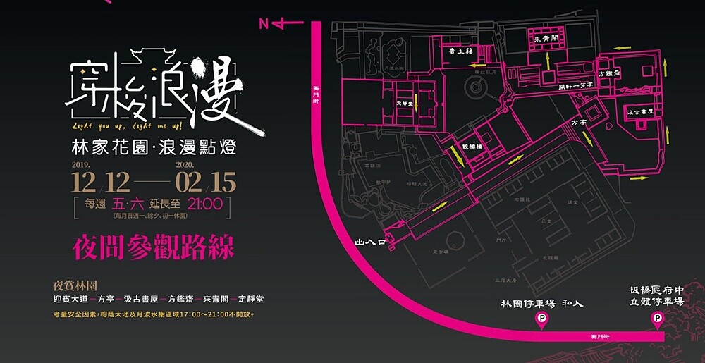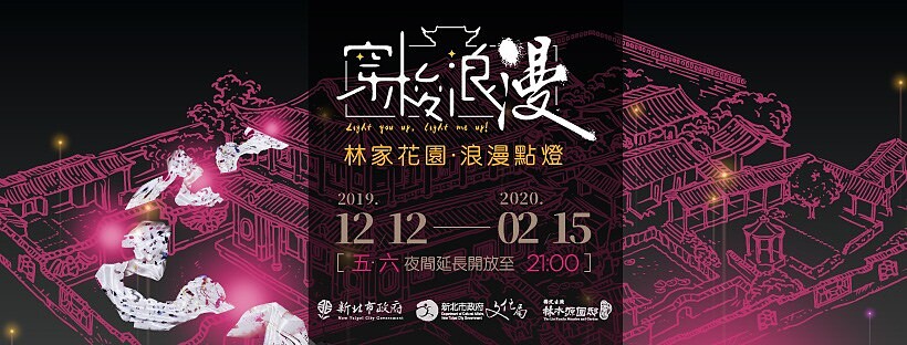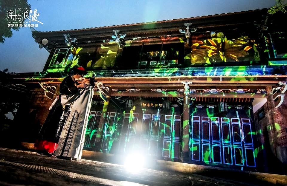 從12/12~2020/2/15,板橋林家花園舉辦起「穿梭浪漫」系列活動,為了提升清代保存至今、台灣目前僅存最完整的園林建築:林本源園邸的夜景經濟,將充滿文化底蘊與文藝氣息的建築,結合了現代科技,每周五、六及特定節日,都會舉辦「蝶舞光綴」光雕投影,多種不同季節、圖案變化的花草配上絢爛色彩,呈現出令人炫目的視覺效果。