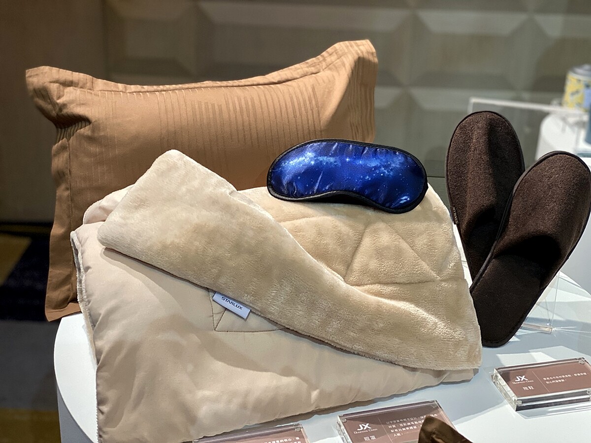 入座後,可以戴上高質感降噪耳機、躺著有正反兩面不同硬度的枕頭、披著有蓬鬆絨毛面及絲滑柔順雙材質的毛毯,好好展開一段頂級飛行。