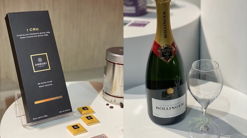 貼心的是,怕旅客因飛行產生水腫,提供炆久之芯滴紅豆精緻的「紅豆水」消腫;還能享用英國皇室指定用酒007詹姆士龐德御用香檳、Champagne Bollinger香檳。不喝酒的旅客可以選擇VDS胡蘿蔔綜合蔬果汁,無負擔地攝取天然膳食纖維。服務熱飲時還會提供有「巧克力界勞斯萊斯」美名的AMEDEI方片巧克力,頂級的飲食服務令人大開眼界。
