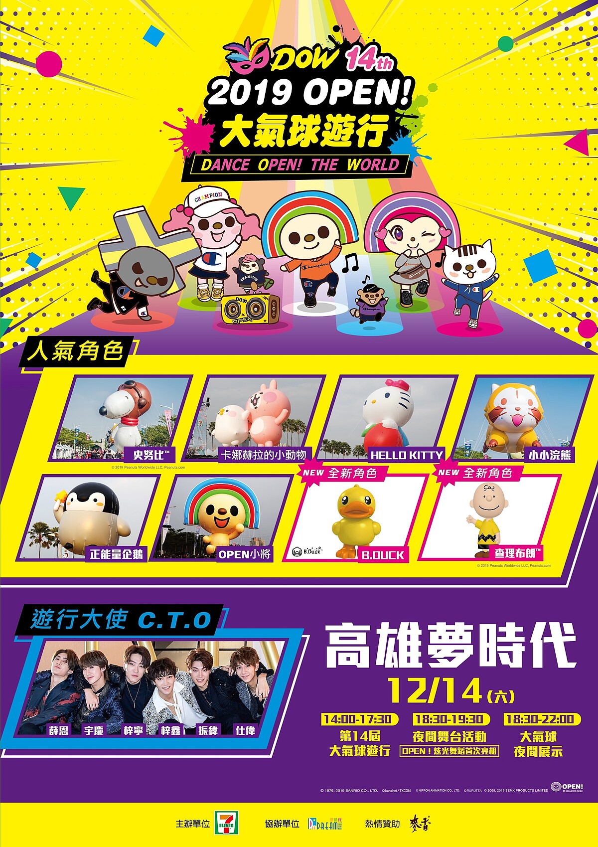 堪稱年度盛事的「7-ELEVEN卡通大氣球遊行」,即將於12/14再次走上街頭!除了招牌的OPEN!家族全員到齊,還會有人氣卡通明星卡娜赫拉的小動物、史努比等巨大氣球飛上天,今年還加入了許多新角色、新活動,全部都要一網打盡啊!