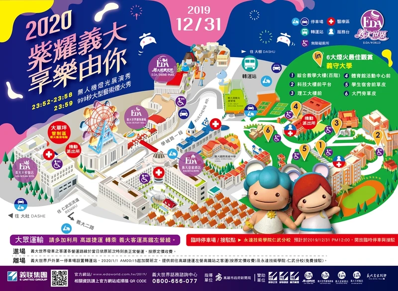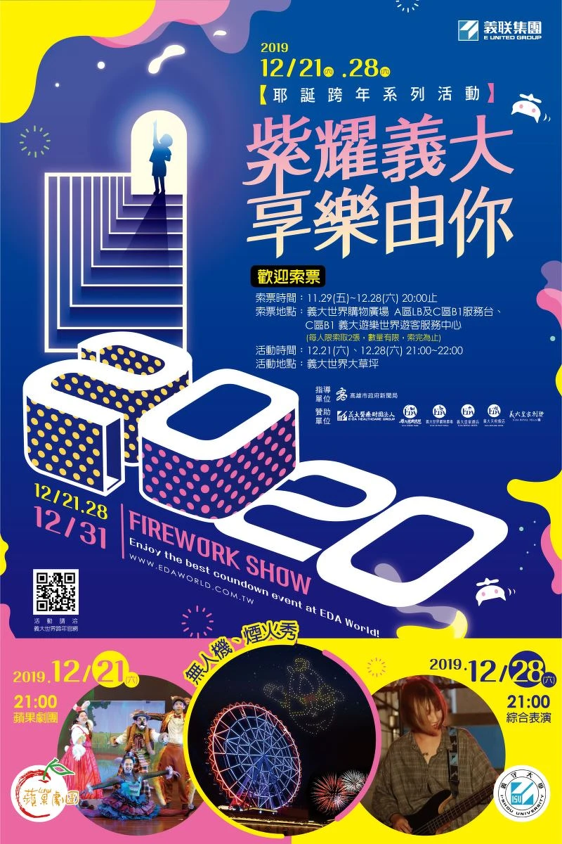 12/31下班完就直奔義大跨年吧!有999秒壯觀煙火外,還出動400台無人機,傳遞四季與台灣山嵐之美,一起帶著滿滿感動迎接2020年!