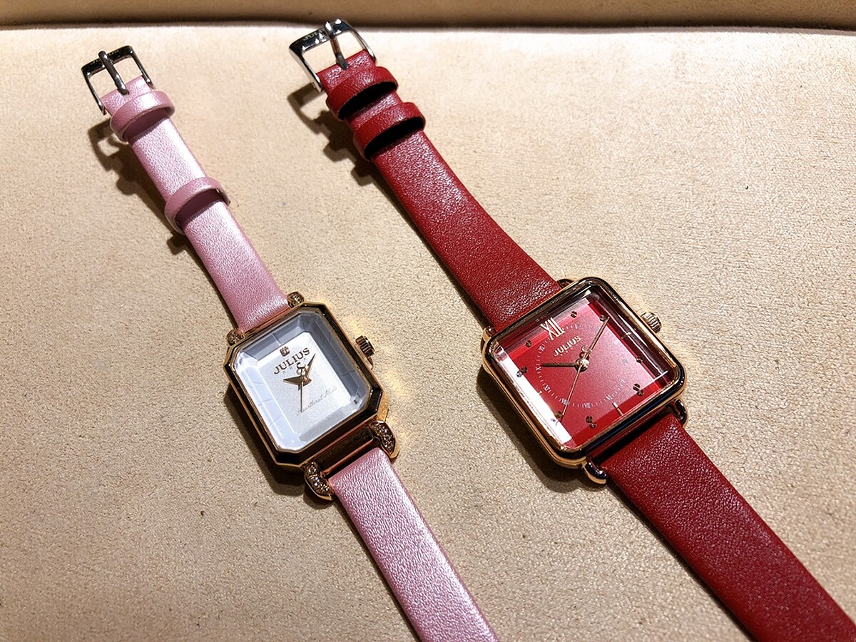 採用日本石英機芯製作,用方形錶殼搭配酒紅色或粉紅色皮錶帶,相當有都會氣質,到1/2前都打9折優惠。