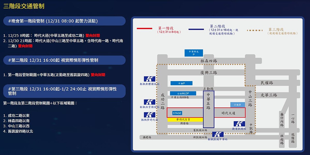 *時代大道(中山三路-中華五路,含時代南一路、時代南二路),12/30 21:00 ~ 1/1 10:00