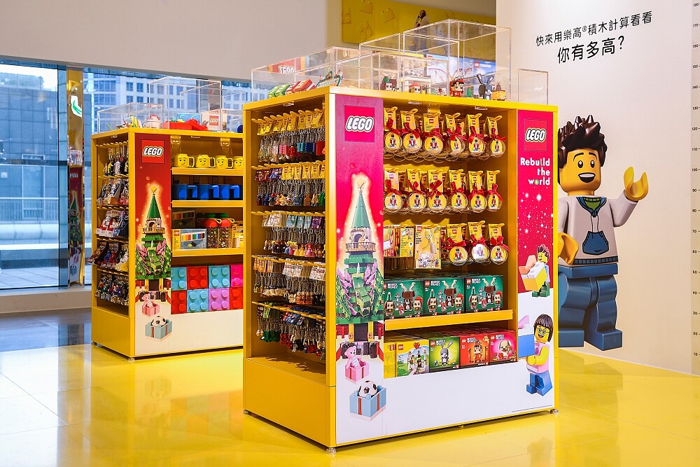比照國際規格,特別設置兒童視角商品展示視窗,讓1~5歲小朋友也能盡情選購喜愛的積木盒組;另外還有體驗遊戲區、遊戲桌,大小朋友都可以充分感受樂高的可愛魅力。