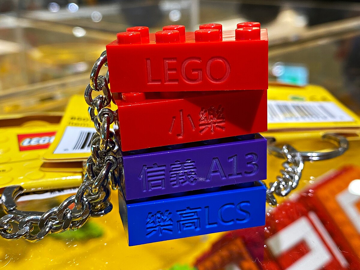 想要刻字在樂高積木上,就要走一遭授權專賣店!可以在鑰匙圈上刻上名字或字句,單面價格為300元、雙面價格為380元。