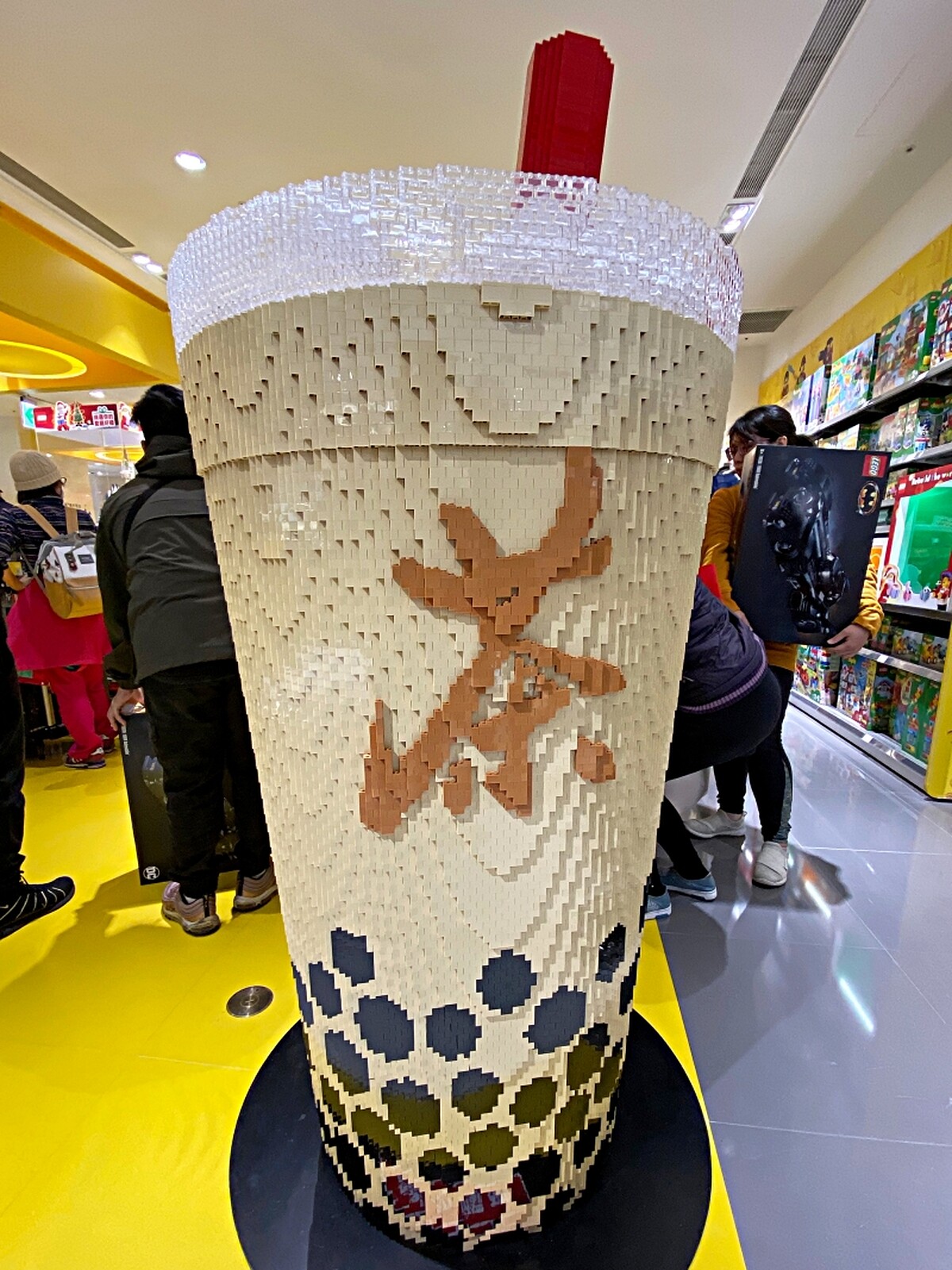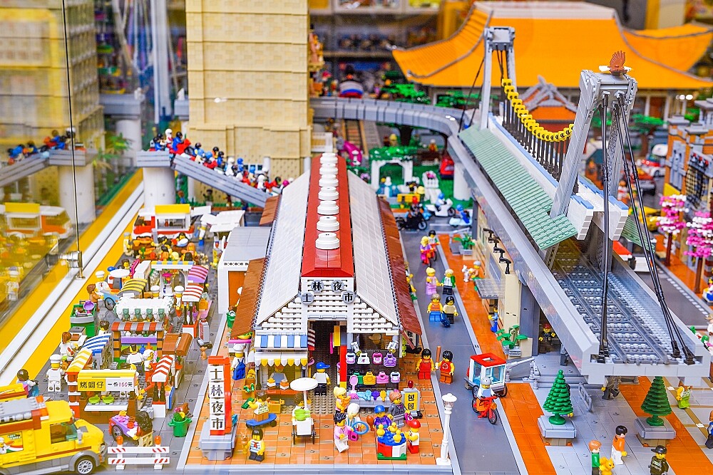 入口處還有一個172公分高的「樂高珍珠奶茶」,神還原的吸睛外型,同樣也是人氣王,開幕當天就有超高曝光度。另外還要張大眼睛看的,就是店內的「台北特色積木造景」,將國父紀念館、士林夜市、劍潭捷運站、西門紅樓、台北橋車潮等充滿台味的建築與景色,化為3米長、2米寬的積木,太令人驚豔!