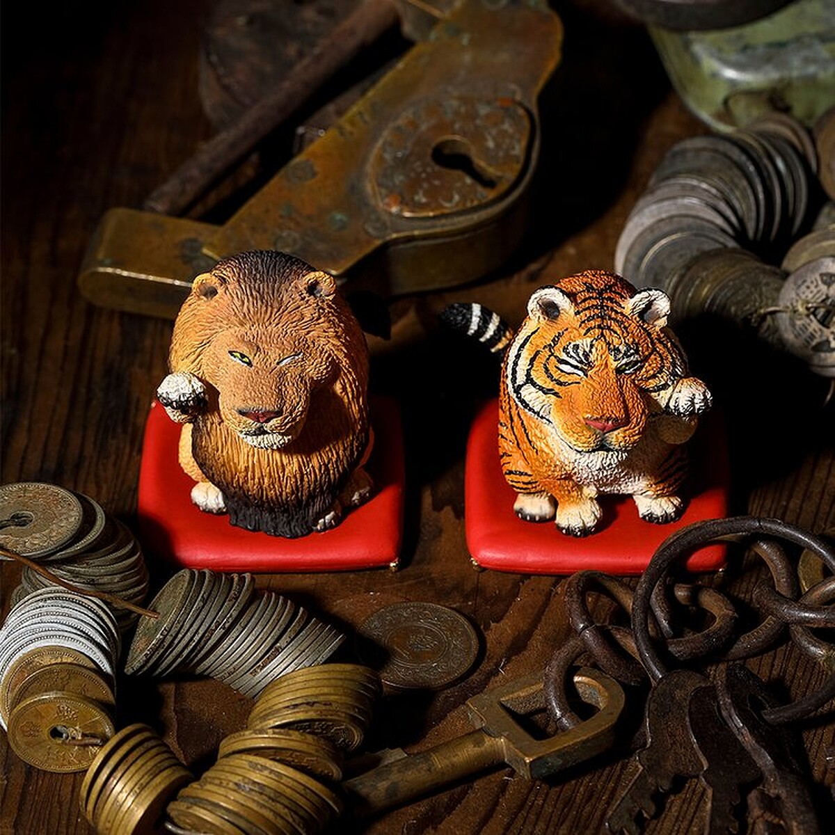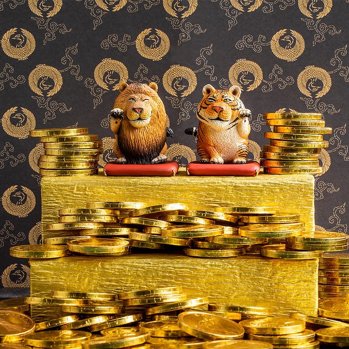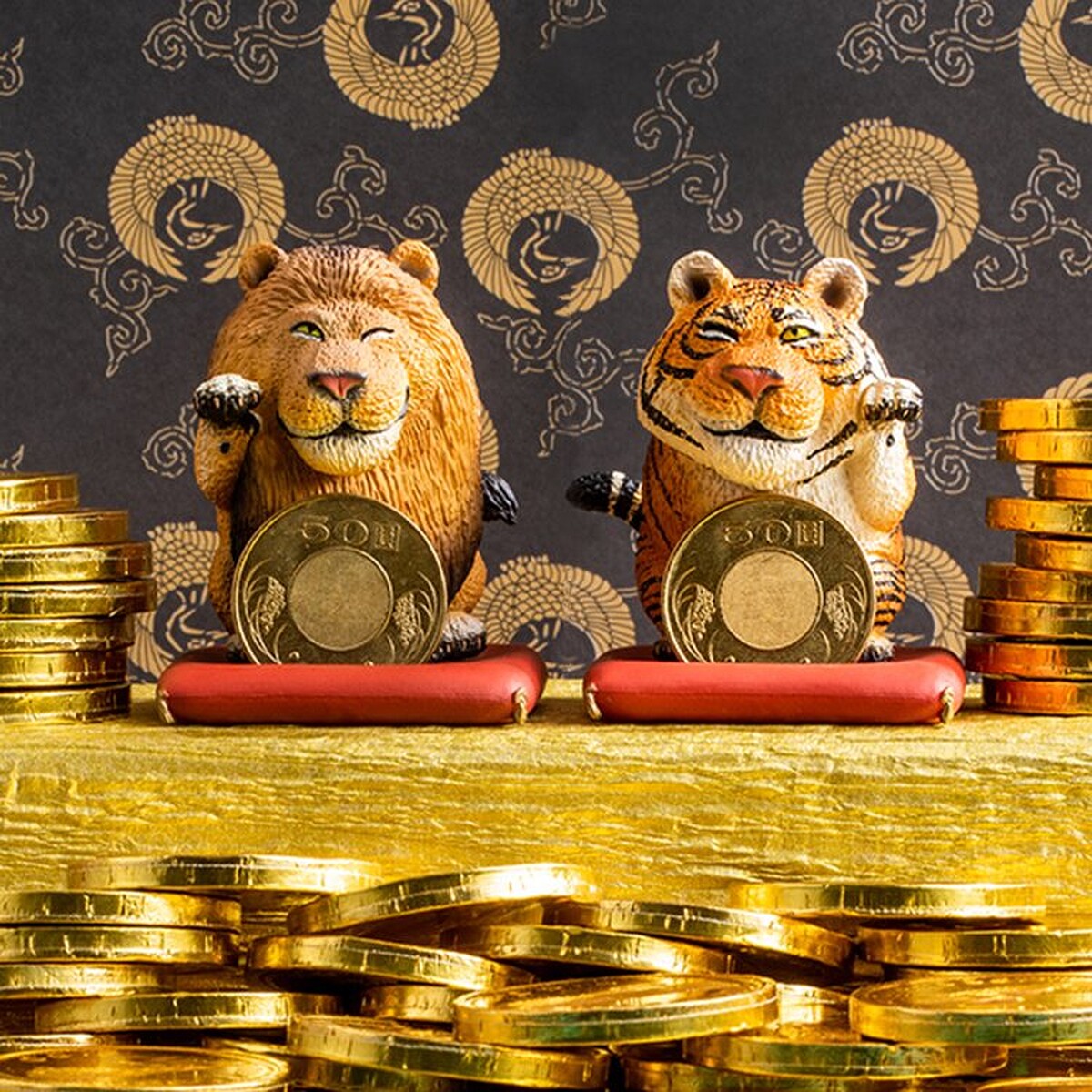 獅子與老虎分別舉不同的手,在日本的招財貓舉不同的手有不同的意義,招左手象徵著招攬人氣與客人﹔招右手則象徵招財及金錢之意。