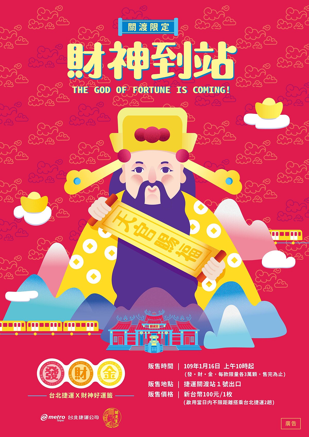 農曆新年即將到來,新年喜慶氣氛濃厚~臺北捷運首度與台北市關渡宮獨家推出3款「財神到站發財金車票」!北捷於2019年與霞海城隍廟推出脫單必備「月老車票」引發熱烈討論,這次「財神到站發財金車票」即將在關渡站限量開賣~