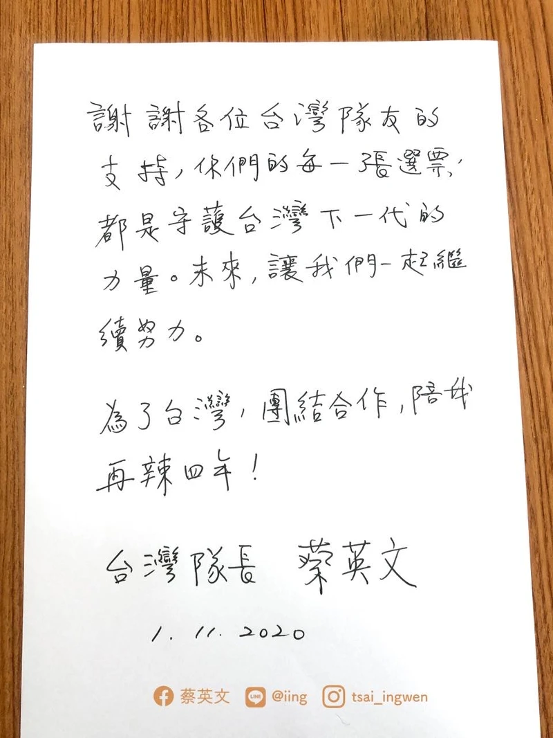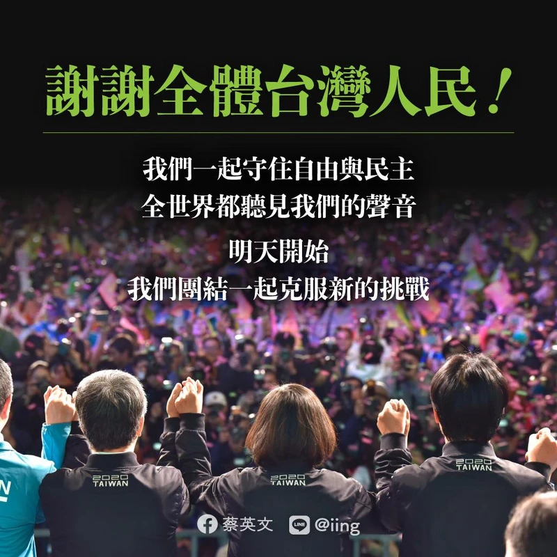 再一次謝謝全體台灣人民。今天,我們守住了民主自由。明天開始,讓我們團結在一起,一起克服所有挑戰,一起克服所有困難。