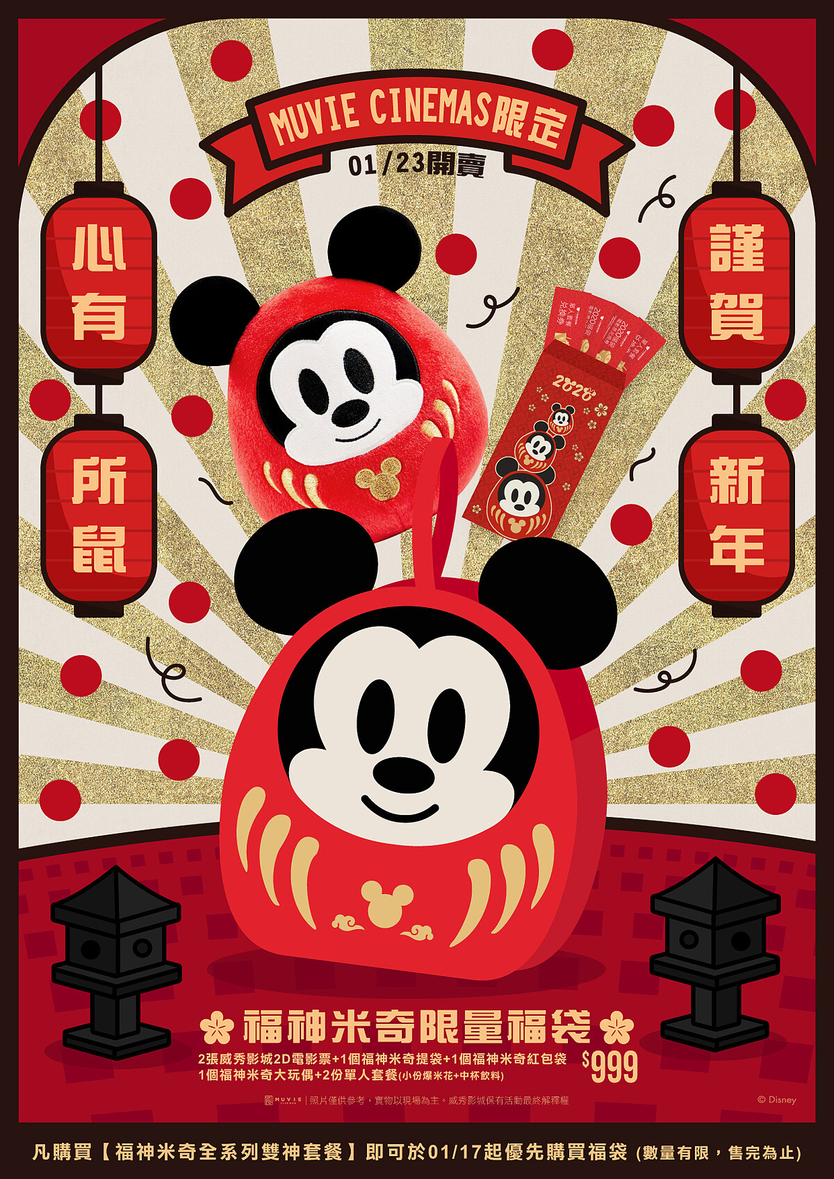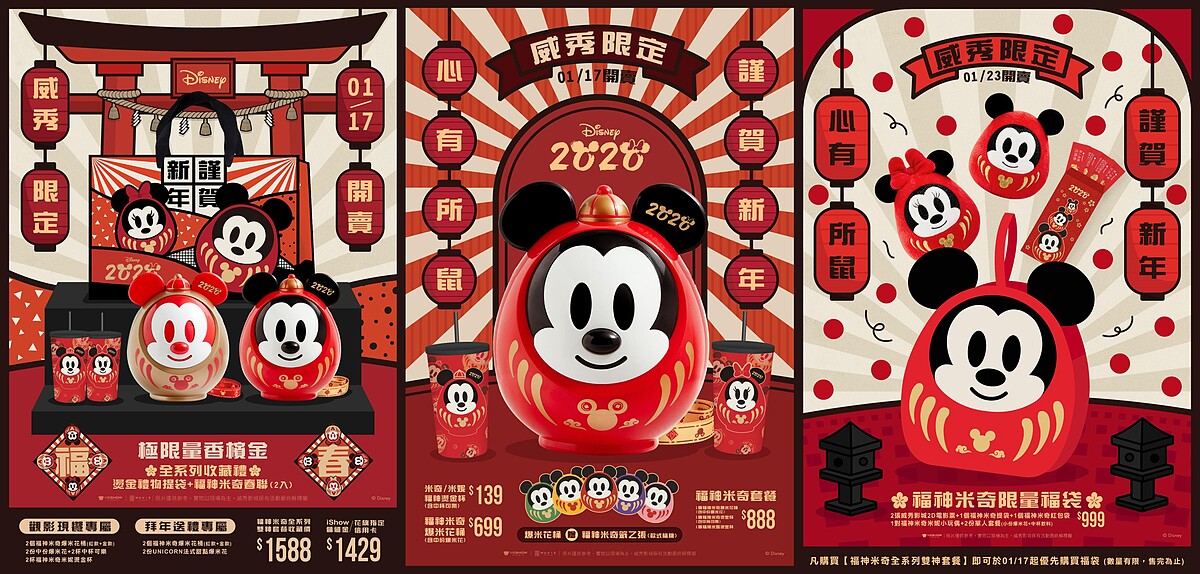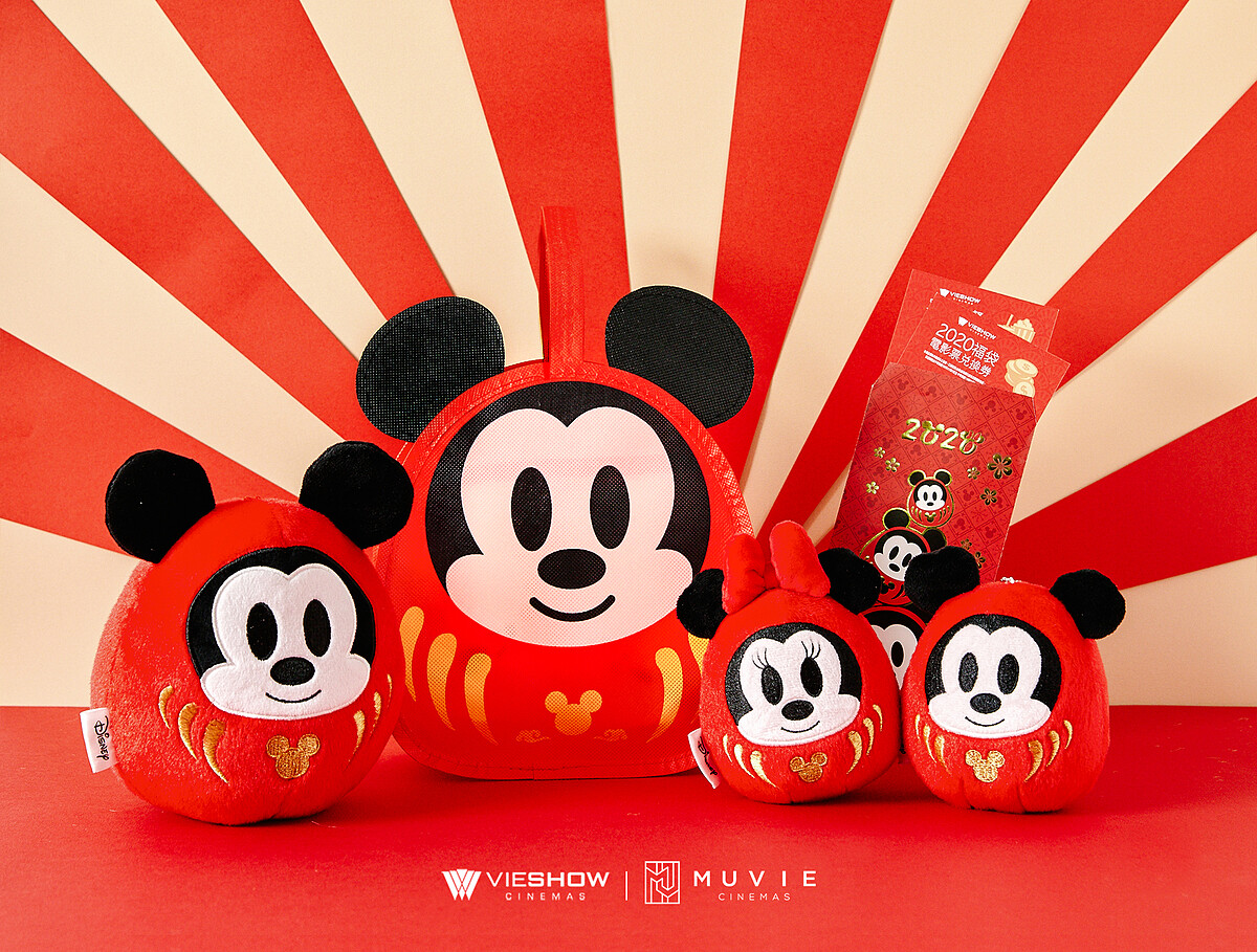 另外還有「開運福袋」,內有2張電影票、2份單人套餐、1對米奇米妮福神造型玩偶、米奇福神造型的提袋以及米奇鼠年紅包袋,福袋中的米奇米妮福神造型玩偶同樣採不倒翁設計。而威秀影城全新頂級品牌MUVIE CINEMAS也特別推出限定福袋,福袋內含大隻的福神米奇玩偶,只有在MUVIE CINEMAS 才買得到。