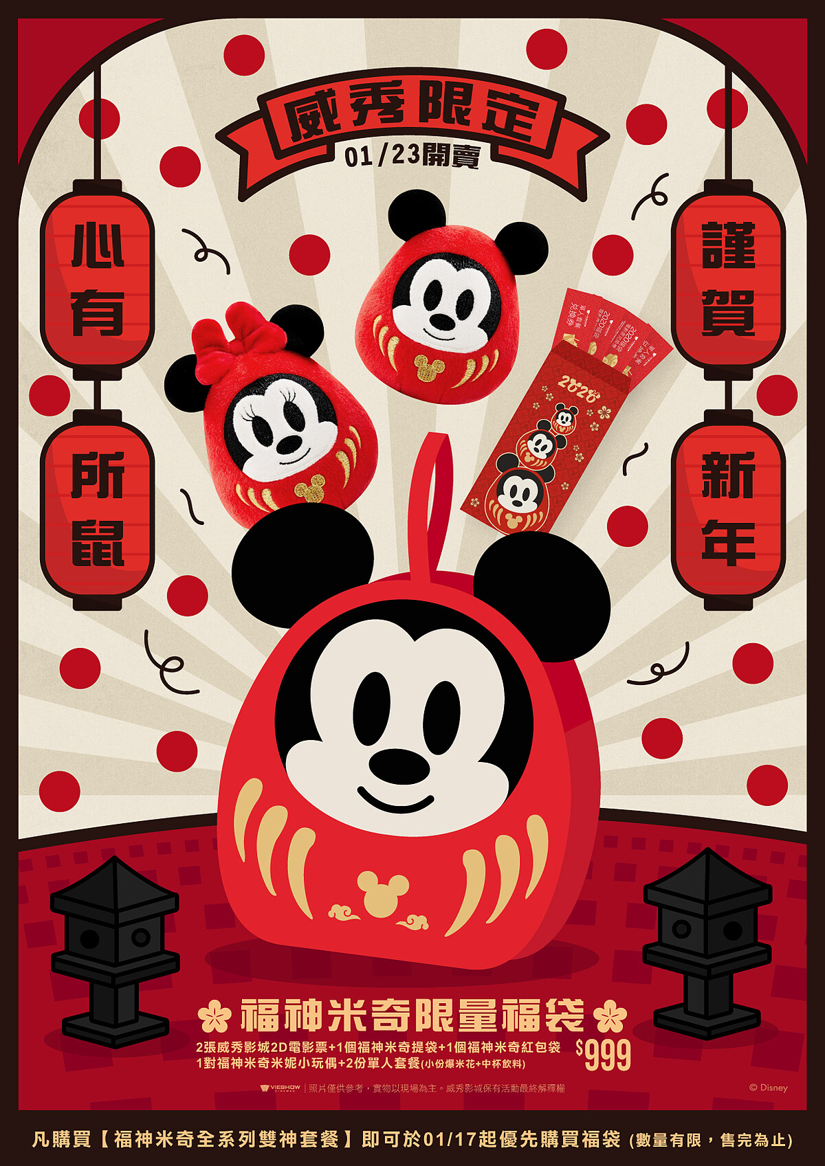 福袋內容:2張威秀影城2D電影票+2份單人套餐(小份爆米花+中杯飲料)+1對福神米奇米妮玩偶+福神米奇提袋+福神米奇紅包袋