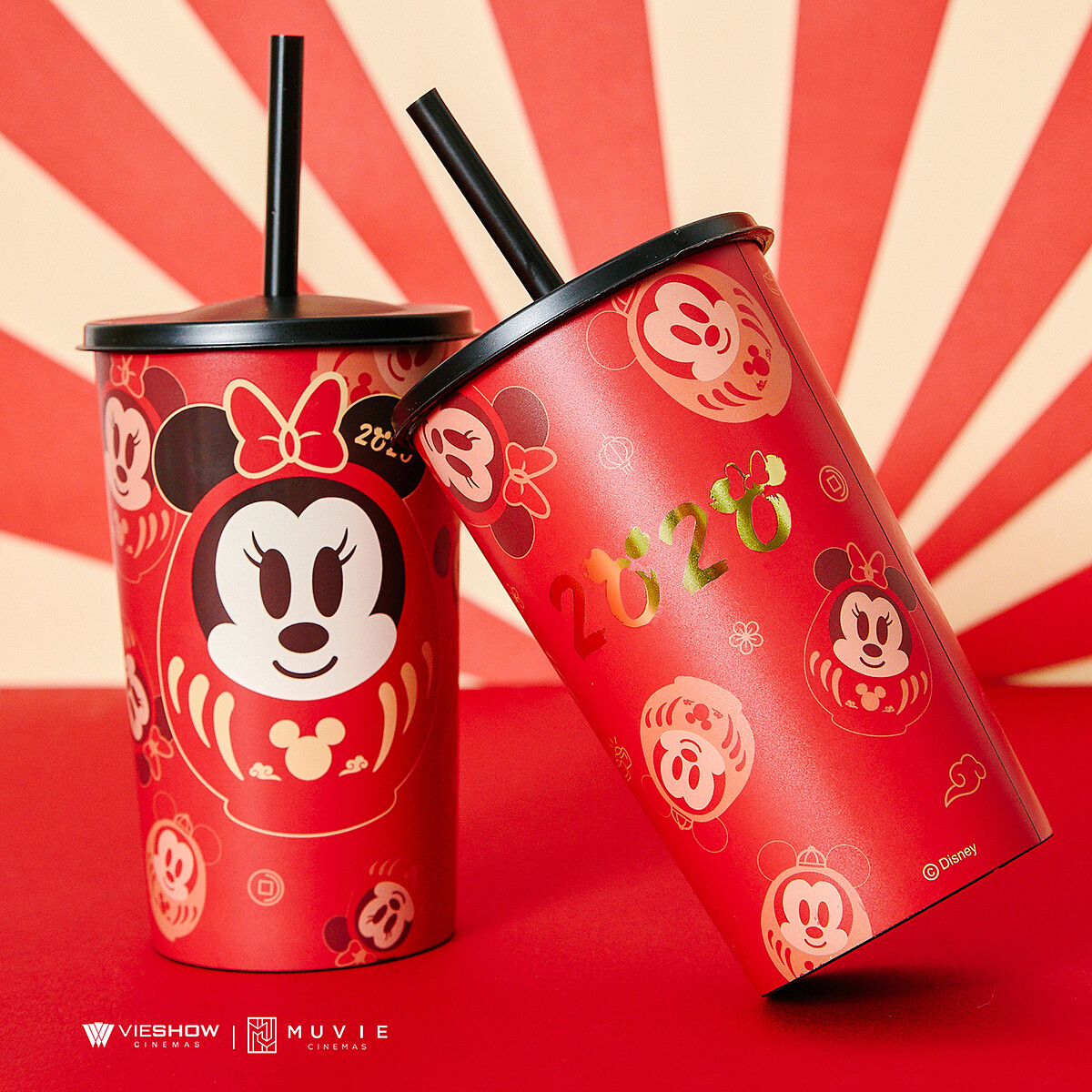 觀影現饗專屬:2個米奇福神爆米花桶(紅款+金款)+2份中份爆米花+2杯中杯可樂+2杯福什米奇米妮燙金盃