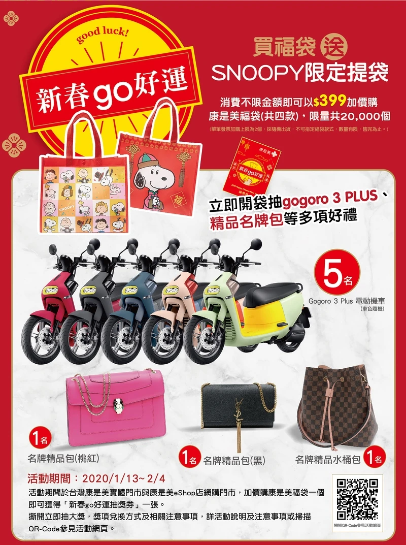 下班立刻殺去康是美COSMED搶福袋吧!即日起推出的「go好運福袋」,售價統一為399元,卻有機會抽到Gogoro、LV、寶格麗、YSL名牌包,福袋外型還有超可愛的史努比,也極具收藏價值,不搶對不起自己啊!