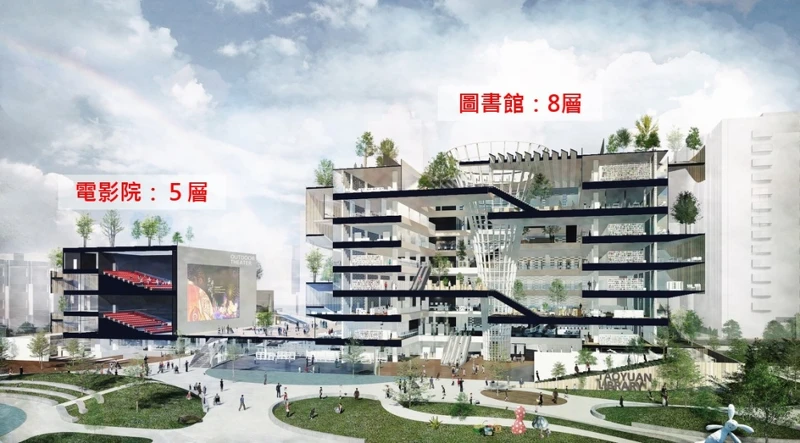 在2018年11月中下旬開工的桃園市立圖書館新建總館,位於中正藝文特區,由地上8層、地下2層的「圖書館棟」,以及5層樓高的「電影院棟」組成,兩棟建築物總樓地板面積約14006坪,會以2樓露臺相互連結。開幕會為集閱讀與藝文於一身的創新園區,更一舉成為全台最大圖書館,