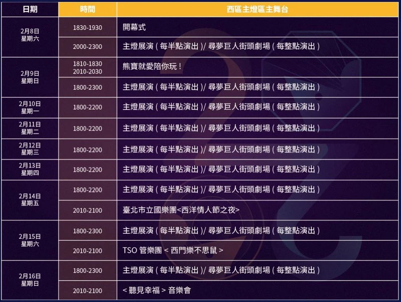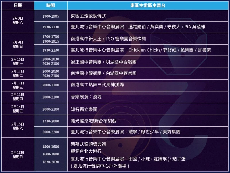 2/15~16在臺北流行音樂中心戶外廣場,還會找來鐵擊、厭世少年、美秀集團、雨國、小球(莊鵑瑛)、茄子蛋等藝人歌手表演,不妨加入燈節行程吧!