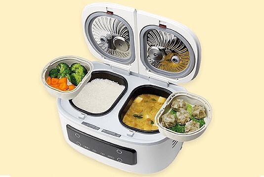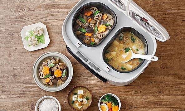 這次日本推出了全新的「Twin Chef自動調理鍋」最特別的是擁有兩個內鍋的設計,可以同時烹煮不同的料理,特殊的分隔設計最多可以一次烹調4種料理,為了避免不同食材之間的氣味混雜,連鍋蓋都是分別開啟~