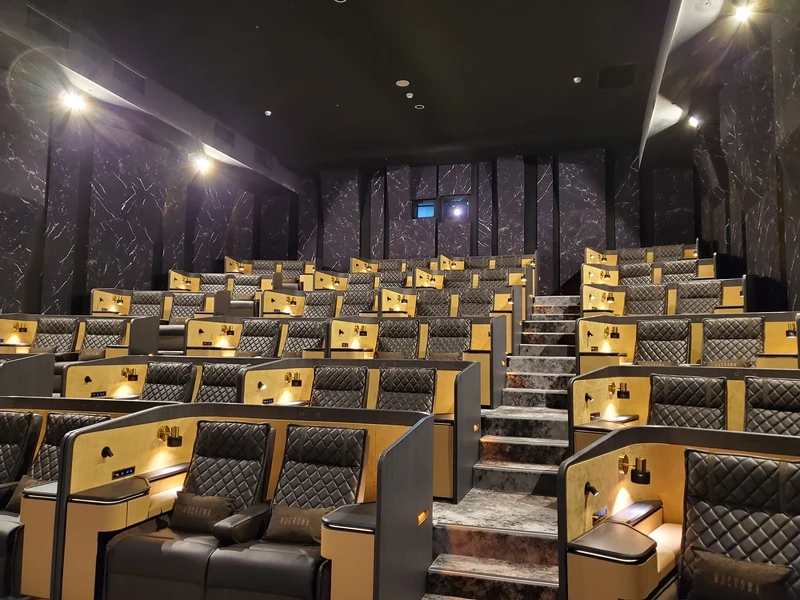 MUCROWN頂級影共有47+1輪椅座位,細看的話會發現專屬置物空間、無線充電、琥珀氣氛燈,呈現出尊榮雅致的觀影空間。一旁還有按鈕可以呼叫服務人員,或恣意調整座椅角度至幾乎平躺的姿勢。
