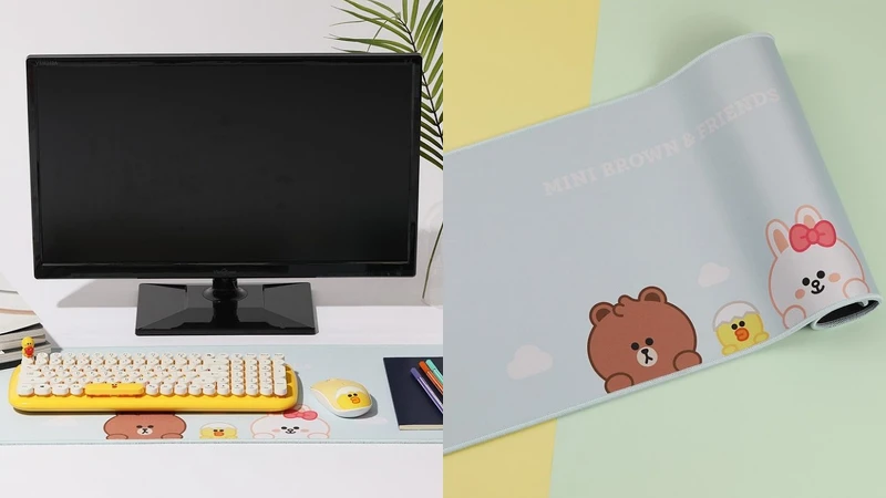 滑鼠墊上,可以看到迷你熊大、迷你兔兔、迷你莎莉Say Hi!正面有防水設計、背面則有防滑材質。長78公分、寬30公分,一秒讓書桌變超可愛。售價13900韓元(約台幣352元),購買連結:LINE FRIENDS 滑鼠墊