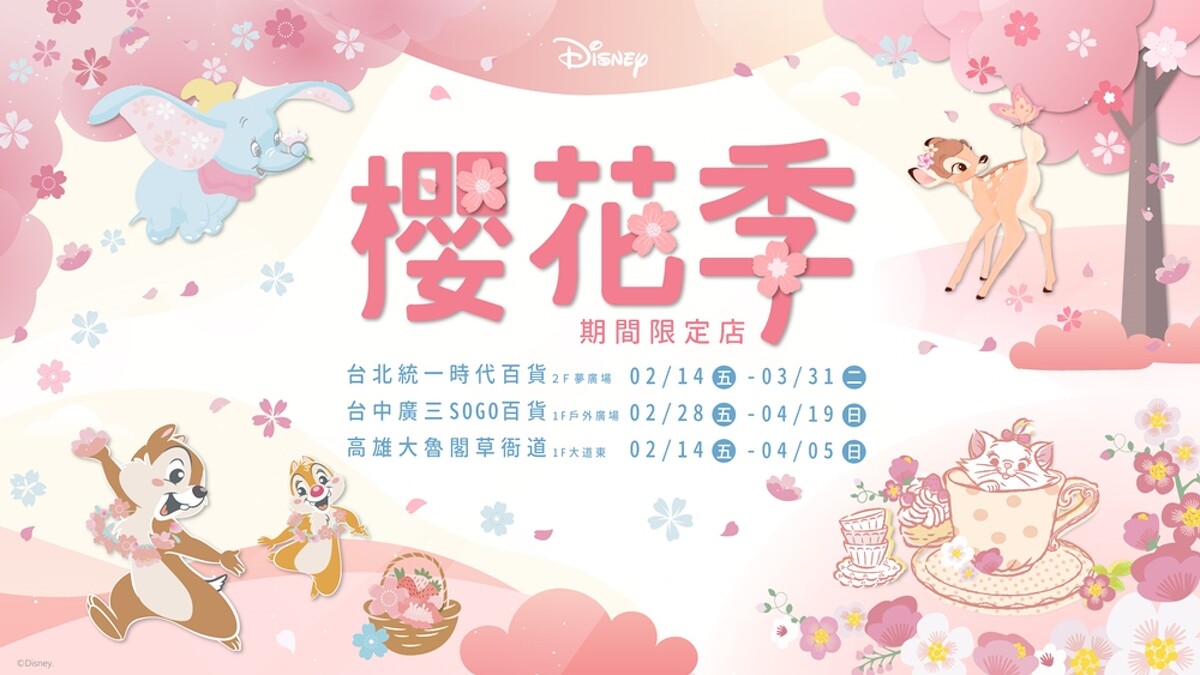 繼去年迪士尼舉辦廣受好評的櫻花祭活動後,今年春年再次推出全新迪士尼櫻花季,以奇奇蒂蒂、小鹿斑比、瑪麗貓、小飛象等四個角色出發,打造浪漫又粉嫩的春季限定活動。分別在北中南三地推出「迪士尼櫻花季期間限定店」,更會以不同主題佈置,逼人全台走透透。