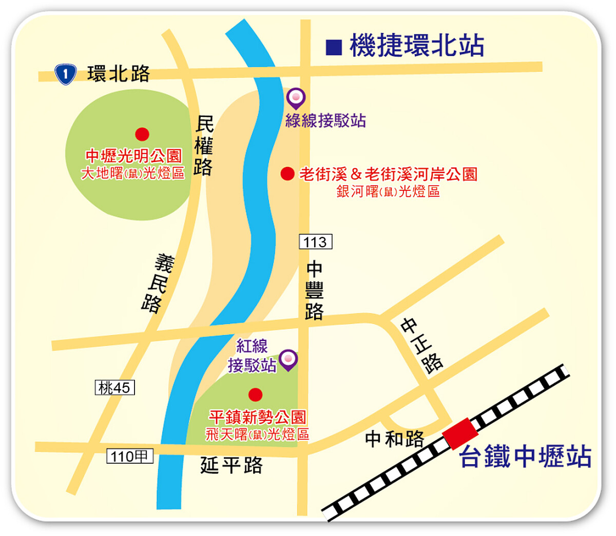 交通:台鐵中壢站、機捷環北站,步行10分鐘至燈區;自行開車可停至台一線泰豐輪胎停車場、七和一街的六和停車場,再轉搭免費接駁車前往