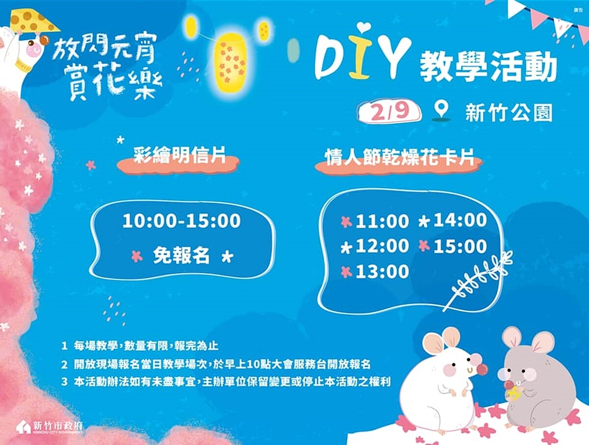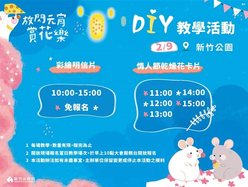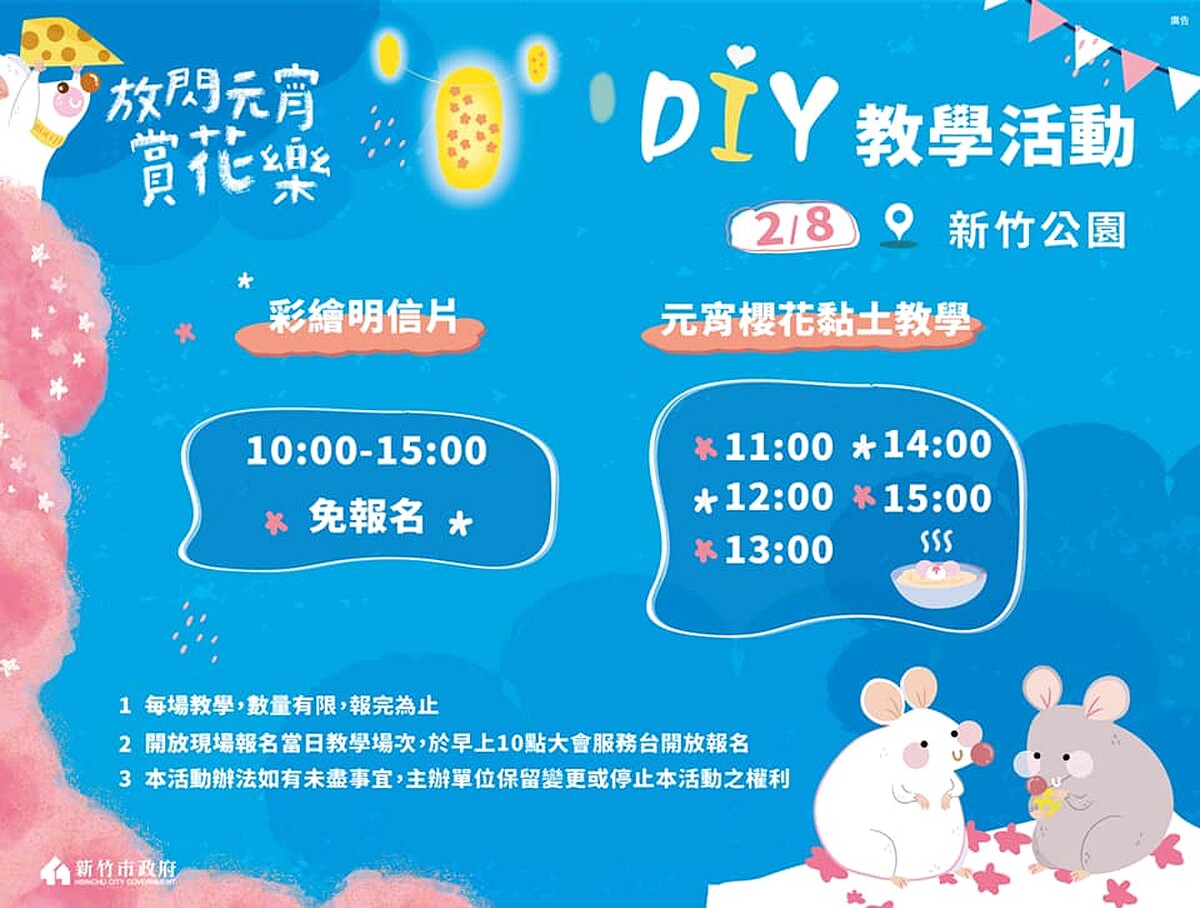 2/8~2/9登場的「放閃元宵賞花樂」活動,下午就有DIY教學活動,2/8有彩繪明信片、元宵櫻花黏土教學,下午4點到晚上8點則有晚會,會邀請到YOYO家族、歌手蛋堡、李千那跟大家同歡;2/9有彩繪明信片、情人節乾燥花卡片。