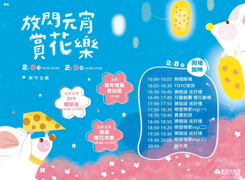 明天(2/8)就是元宵節,台灣各地燈會都熱鬧登場,新竹舉辦限時2天的「放閃元宵賞花樂」元宵晚會活動,邀請大家觀賞「城市躲貓貓」藝術燈飾展覽之外,還能一起賞櫻花!更為了元宵節特製「起司鼠來寶小提燈」,可愛外型立刻引起網友尖叫,直呼:「好想要!」領取時間、地點現在就大公開。