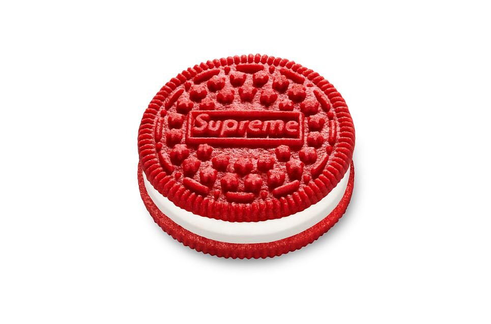Supreme在2/17釋出最新春夏系列型錄,相較於各式服飾配件吸引,更引發熱論的是,竟出現了一塊OREO!是將雙倍夾心改成Supreme大紅色,上面還印著招牌紅色Box Logo,是否為聯名還不明確,但官網上敘述每包會有3個餅乾,立刻令潮人們爭相關注、紛紛好奇售價。