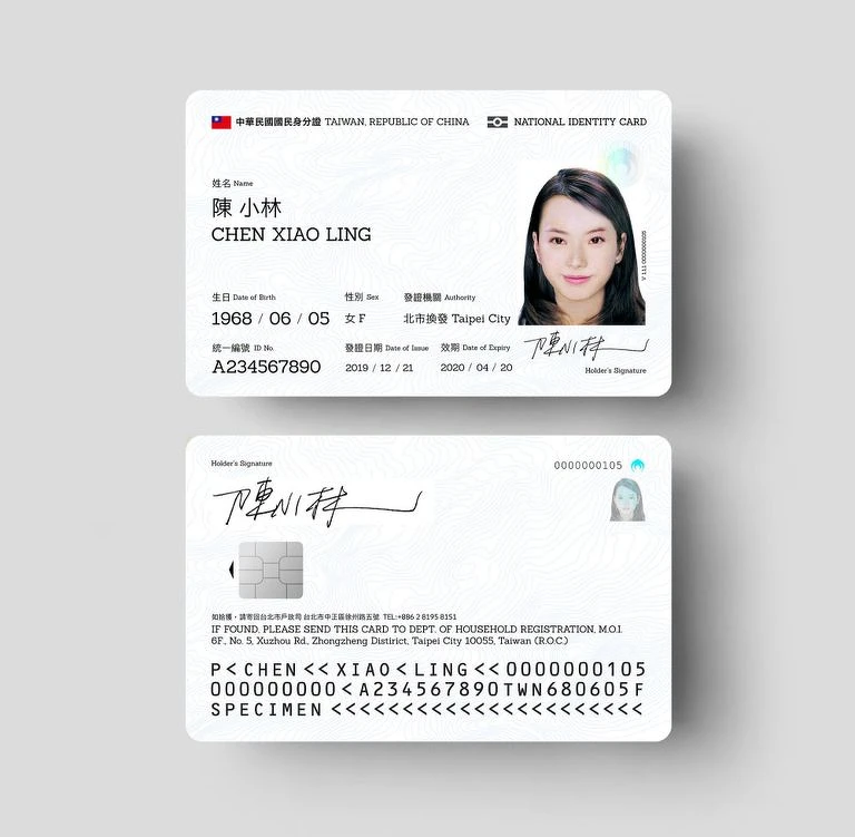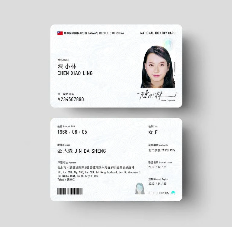 一眼就能感受到與舊版的不同,便是卡片清爽、簡潔許多!正式命名為「中華民國國民身分證REPUBLIC OF CHINA (TAIWAN)IDENTITY CARD」,與護照封面一致,還會放置國旗。下方則有台灣全島形狀的光影變化箔膜,耐用度長達10年。另外使用多層融合、雷射雕刻技術強化防偽。