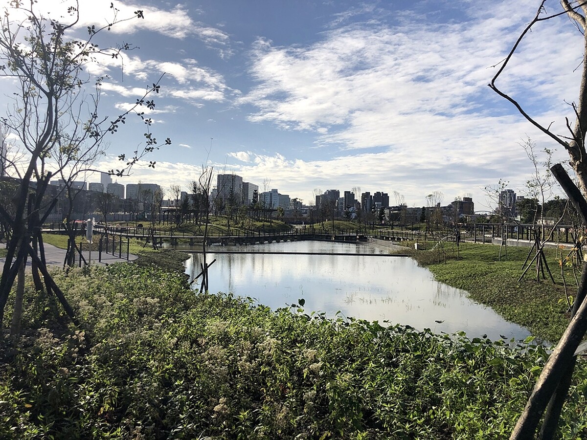 而公園中央的濕地水池不只能觀賞,更可以收納約2600噸水量,平時能將池水引導到四周、配合「外高內低」地形將水流向公園中央水池,營造濕地氣候;若颱風、豪大雨來臨,濕地水池則能收集降雨、減少周邊市區排水負荷,以降低淹水風險。