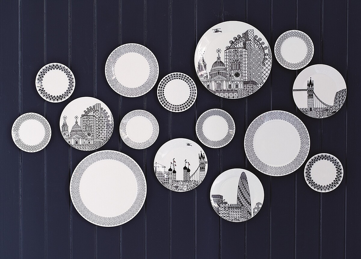 聯名倫敦居家織品設計師夏琳穆倫Charlene Mullen,以品牌發源地倫敦為靈感,將4大經典著名地標:倫敦眼、聖瑪莉艾克斯30號大樓(小黃瓜大樓)、倫敦鐵橋與倫敦塔,作為餐瓷主角。黑白色調上有著如織品的柔軟線條,還有動感的旗幟及直升機,為整體注入活力焦點,擺上桌便充滿濃濃異國情調。