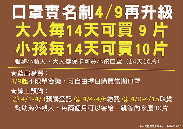 6. 口罩價格每片5元,需自付7元物流處理費,4月9日起每14天可購買口罩,成人9片、兒童10片。
