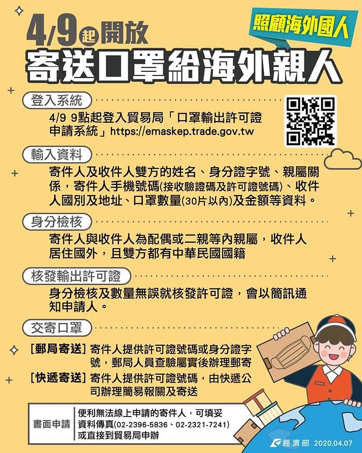 中央流行疫情指揮中心宣布自4月9日起,開放民眾寄送口罩至海外給二親等以內親人 ( 收件人及寄件人必須具中華民國國籍 ),每兩個月可寄30片,須上網申請許可證,憑許可證才可寄送 ( 申請網址:https://emaskep.trade.gov.tw ),詳細Q&A可至經濟部國貿局經貿資訊網。