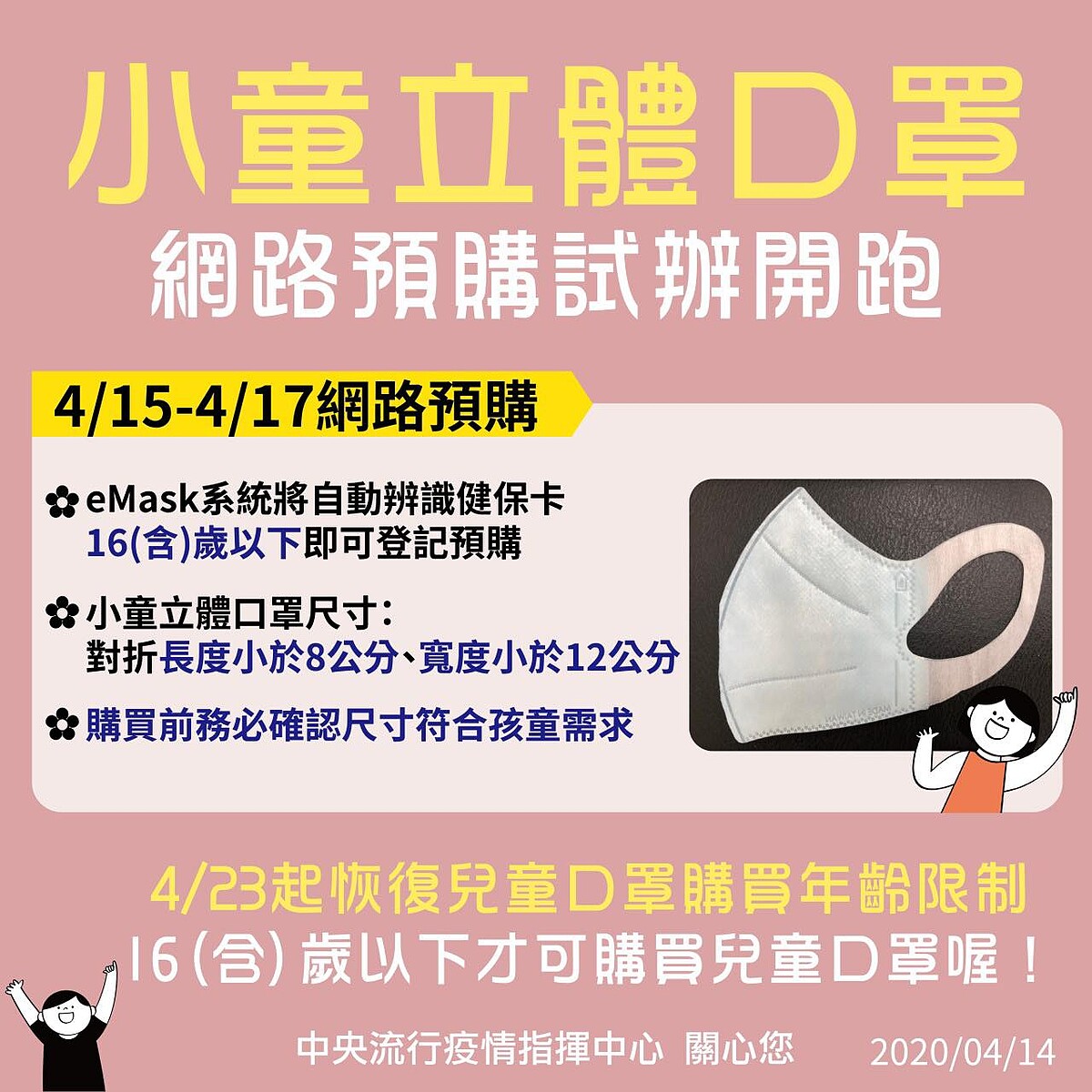 購買年齡限制:4月23日(四)起,僅有16(含)歲以下健保卡才能購買兒童口罩
