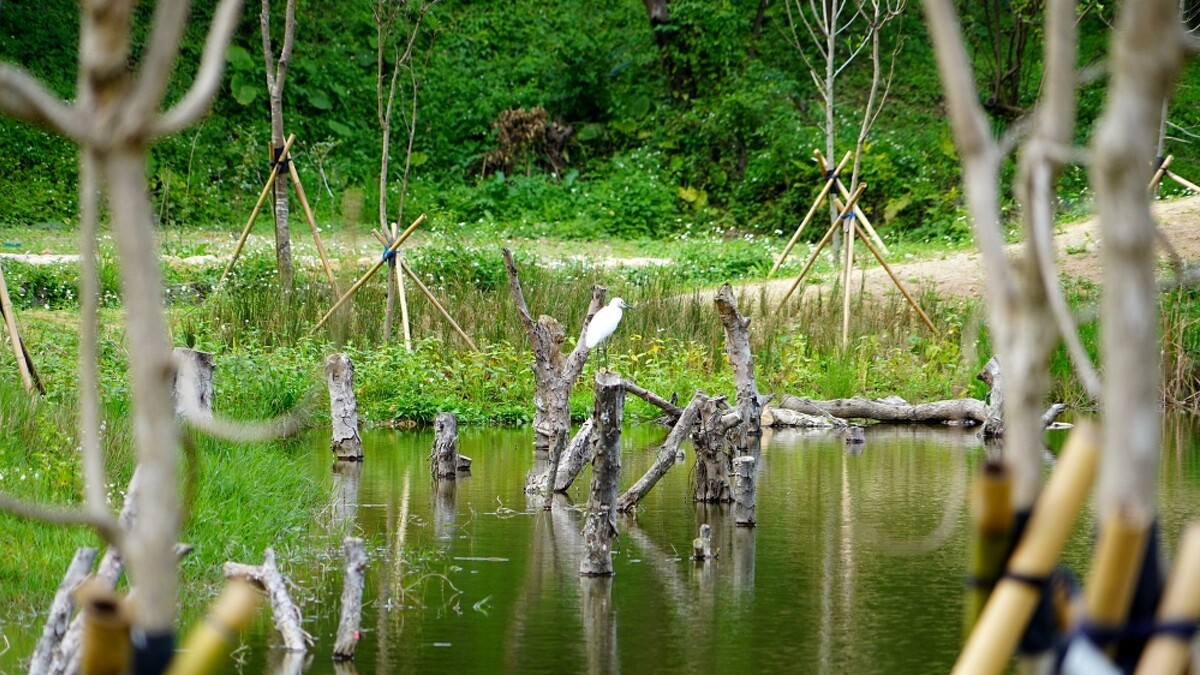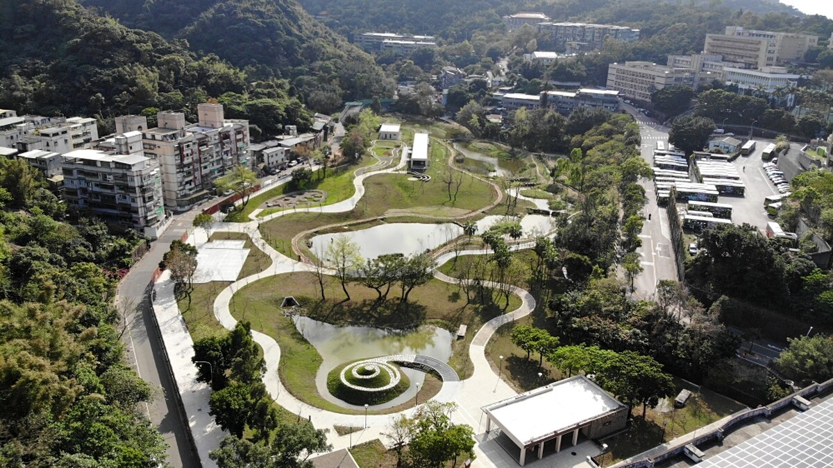 為了重現埤塘風貌、提供市民豐富生態體驗,園區規劃為生態復育區、緩衝區及人為活動區三大區塊,僅保留3棟既有營舍改為公園場館。也考量到四季色彩更迭,植栽精心挑選能招蜂引蝶、具變化的喬木,數量則多達38種,每次前來走走都會有不同舒心感受。