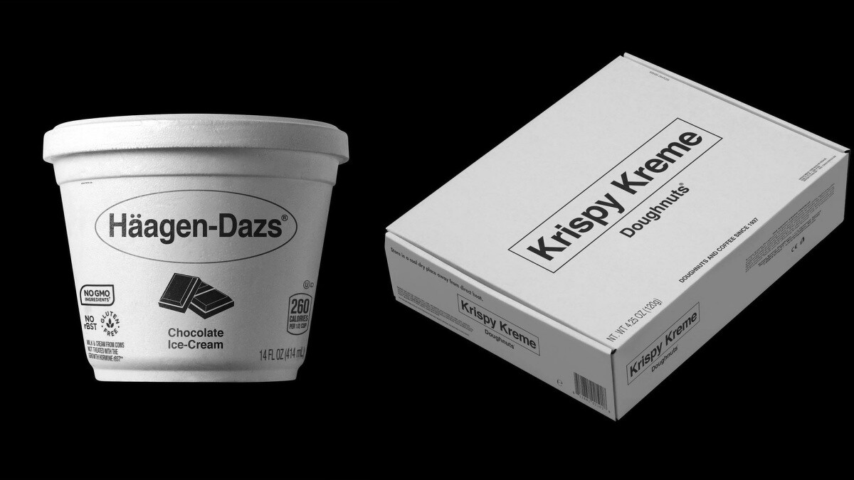 連哈根達斯冰淇淋、krispykreme甜甜圈的外包裝也變成黑白色,看久了真的會想不起來本來的外包裝!
