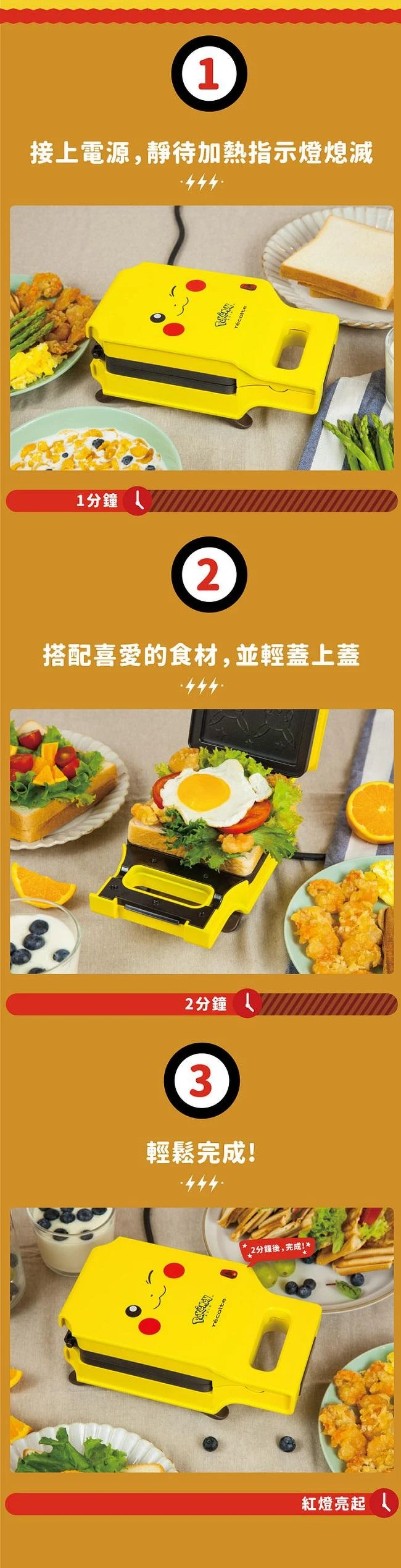 使用方式也相當簡單,先插上電源1分鐘待加熱指示燈熄滅後,接著放上喜歡的食材、依食材厚度選擇不同卡準,之後烘烤2分鐘就能完成酥脆三明治,上面還會壓印上皮卡丘的4種超萌表情,看到這個肯定精神都來了。