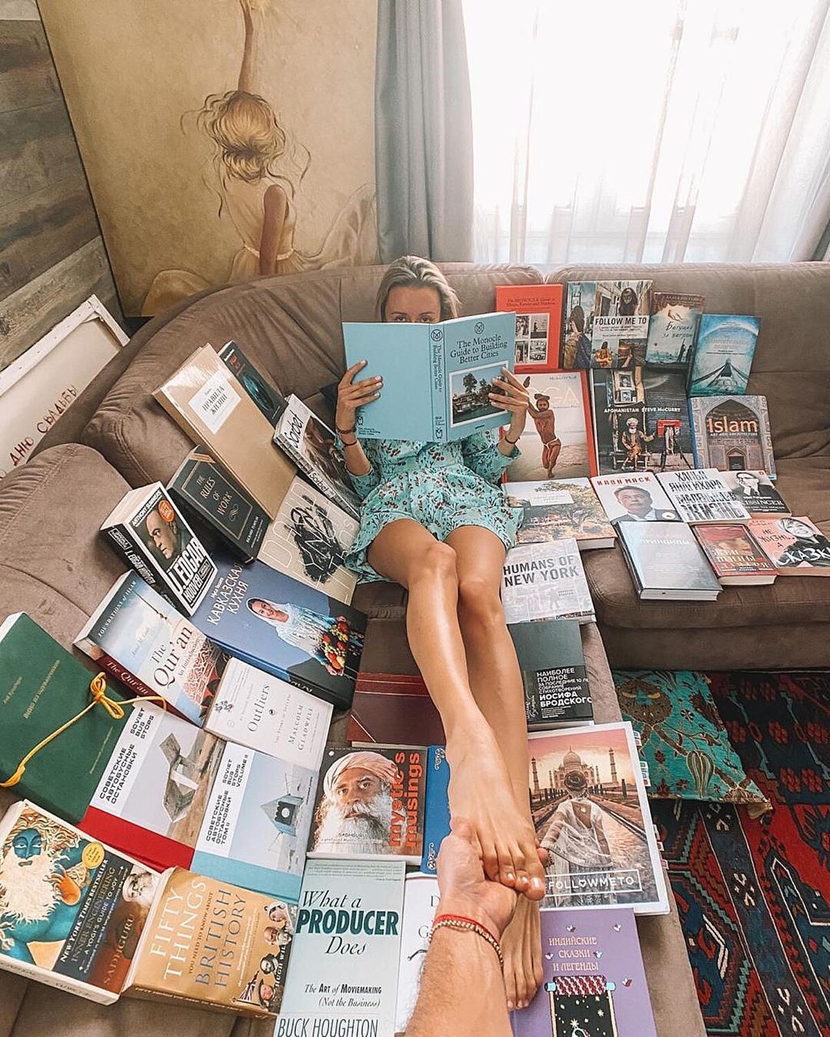 疫情之下一起宅在家與書堆為伍充實心靈,這次不牽手改牽腳俏皮十足,像是日常生活中的情侶間的小情趣!