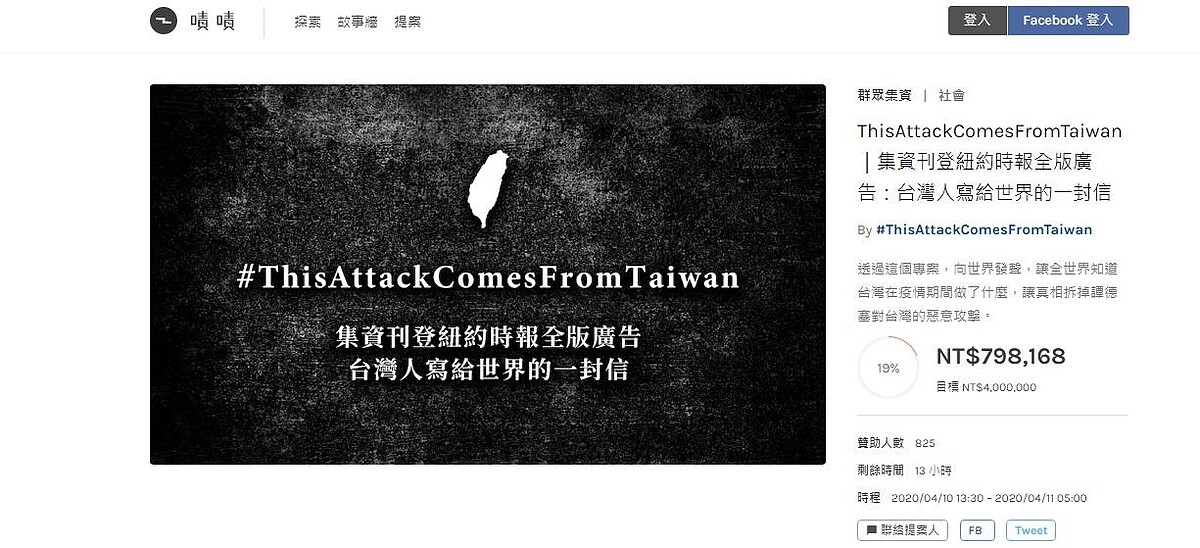 發起執行團隊包括聶永真、阿滴、林祖儀、張少濂、張志祺等,募款時間為4月10日13:30至4月11日05:00止,紐約時報預計訂於2020年4月13日週一刊登,截稿時間最晚為台灣時間 4 月 11 日週六凌晨5 點,由於美國紐約時報的全版彩色廣告報價為 114,437 美金,折合台幣約 344 萬元,加上廣告製作、行政雜支以及平台金流費用,集資目標為400萬。