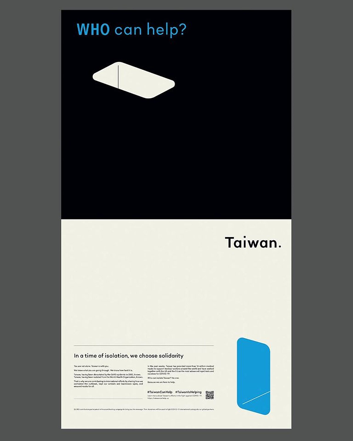 由聶永真操刀的廣告視覺,其中的圖像語意「WHO」三字使用世衛官方字形,主標問句選用世衛標準色藍,將其隱喻提供閱聽人解鎖。而「WHO can help? 」則是隱喻世衛於流行疫情爆發時刻,因反應遲緩與外在政治干擾,所引致的防疫缺口,以及全球深陷的棘手難題。