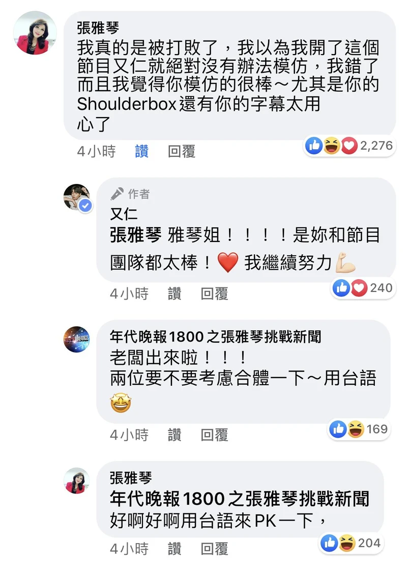英文版致敬上線後,本尊張雅琴以及製作單位立即在臉書留言回應,稱讚又仁用心,還邀請又仁下回一起來挑戰台語播報。