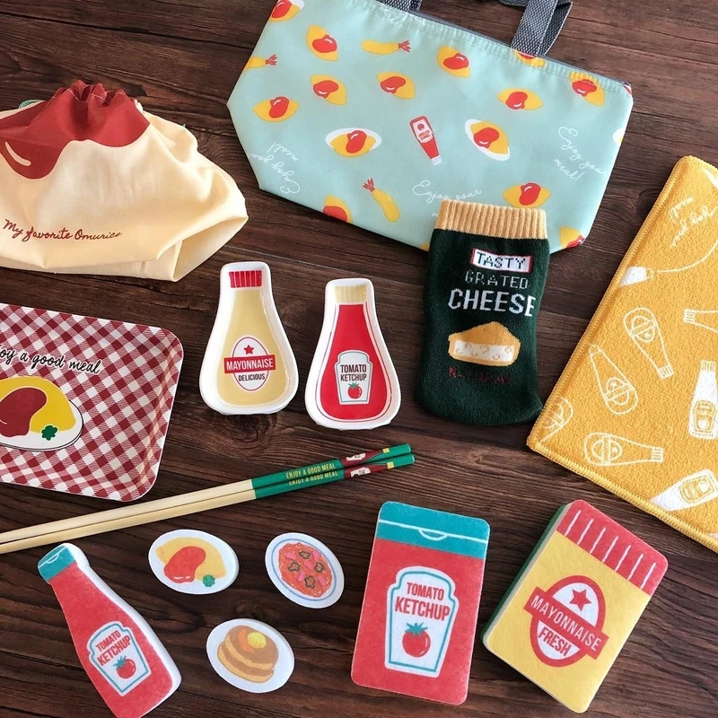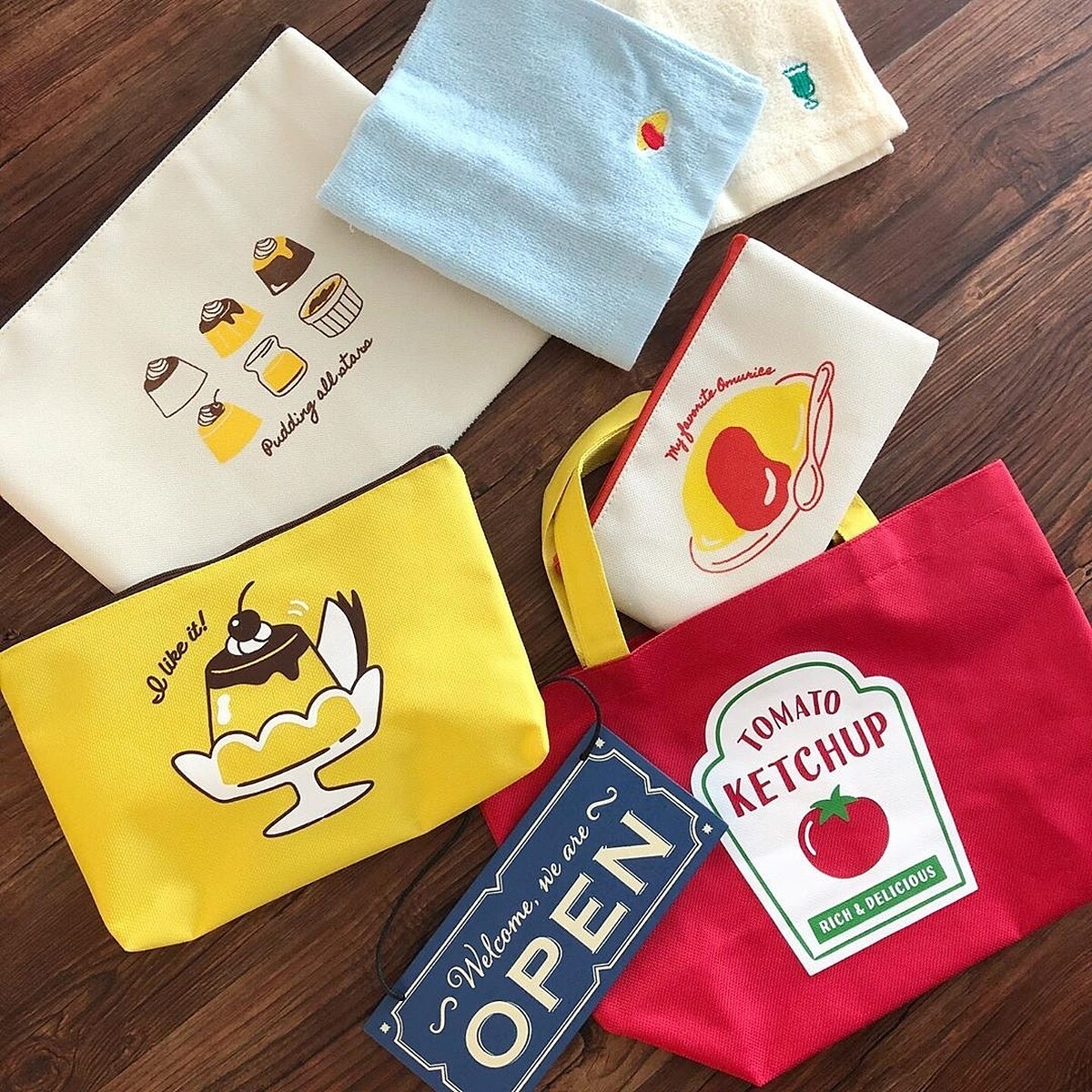 印著蛋包飯和炸蝦的水藍色托特包,還有古錐的番茄醬小碟,拿來裝番茄醬搭外帶回家的薯條,好吃度立即提升!