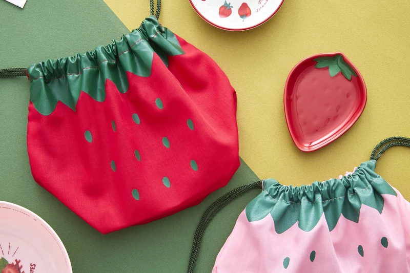 束起來就變成一顆草莓形狀的草莓束口袋,不只可以裝便當,也可以收納所有隨身小物,是萌系爆表的收納包。