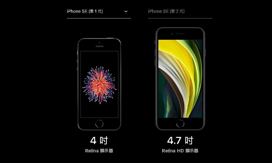 比起上一代的iPhone SE,第二代搭載4.7 吋螢幕,稍微大一些,玻璃與鋁金屬設計,防潑抗水能力在最深達 1 公尺水中最長可達 30 分鐘。