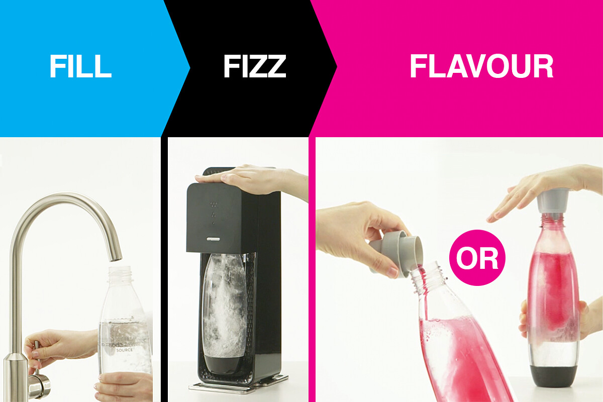 Fill: 將任何未經調味的飲用水 (開水、純水、電解水、蒸餾水等)注入Sodastream專用水瓶至滿水線