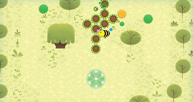 移動游標就能控制蜜蜂的行動,觸碰旁邊有花粉的花朵,分別有5種花的類型,蜜蜂最多可以攜帶三個花粉,接著前往同色的花朵授粉就行了,成功受粉後還會有幾隻驚喜小蜜蜂飛出來,相當可愛!
