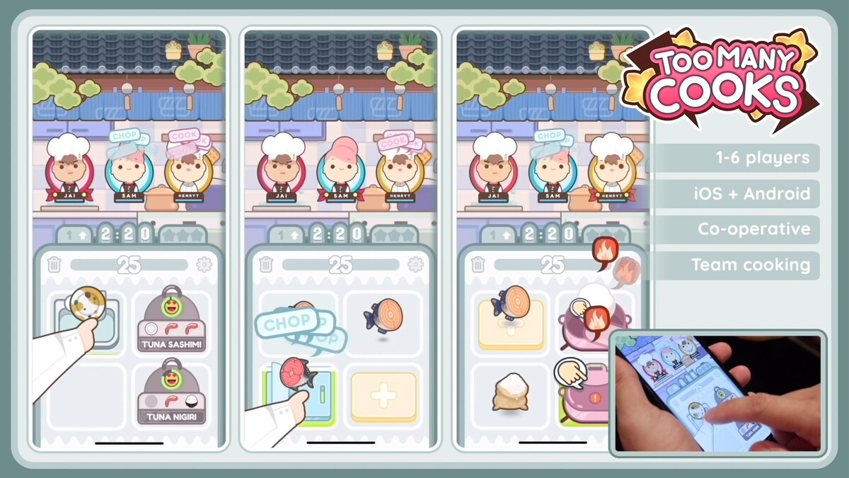 《Overcooked》中玩家必須要在規定時間內分工合作,像是切菜、主菜、洗碗盤、上菜……等等,而手機遊戲《Too Many Cooks》也需要與好友分工完成洗碗、烹調、上菜……等等步驟!