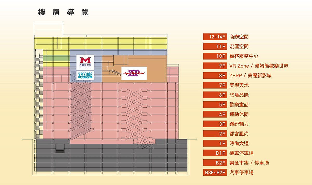 8樓:專業展演場館場館「Zepp New Taipei」、電影院「美麗新影城」