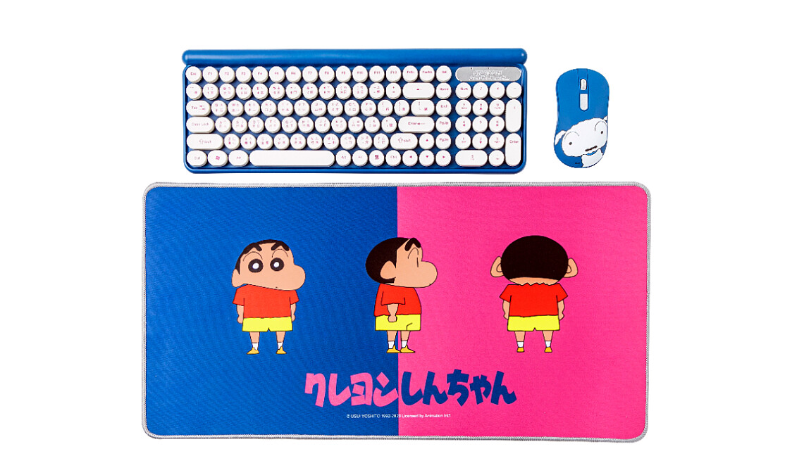 3C控則必收「是在哈囉無線鍵盤組」,有超萌蠟筆小新滑鼠墊、小白滑鼠、復古打字機鍵盤三件套,還是無線設計,讓辦公時光增添趣味。