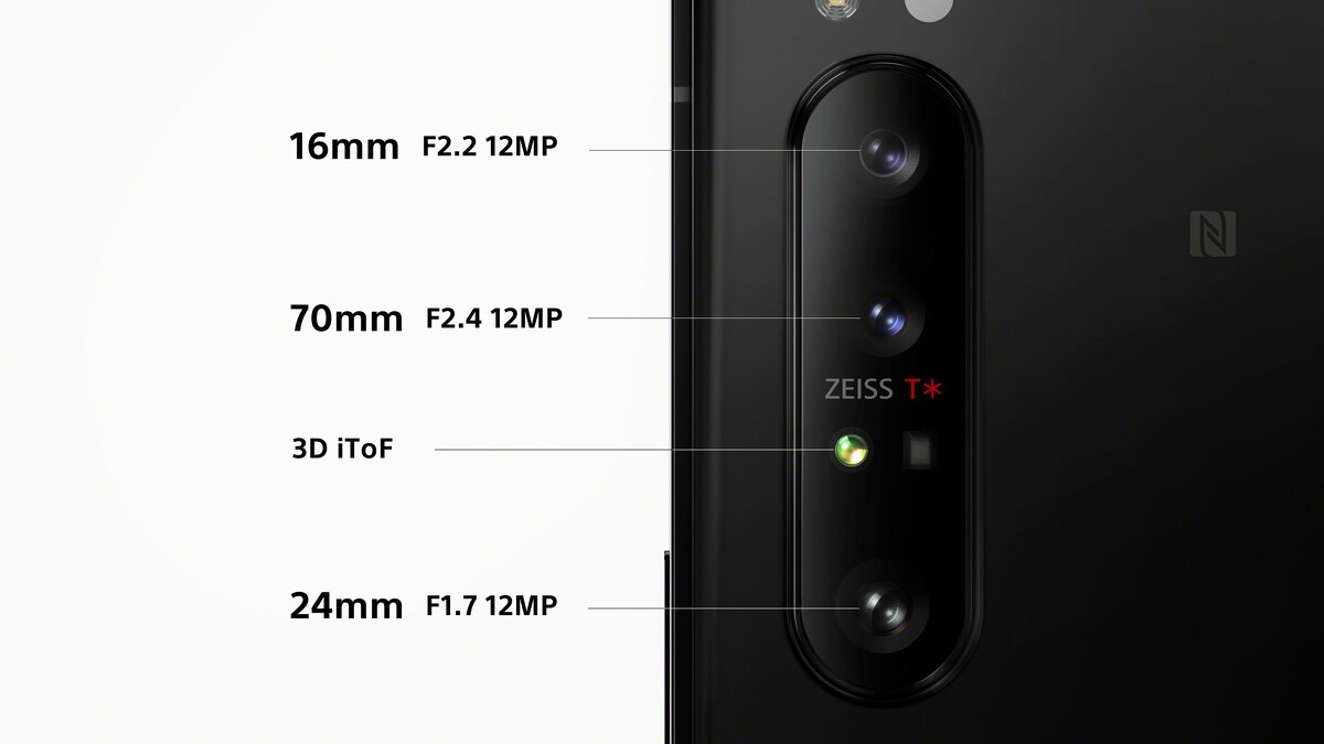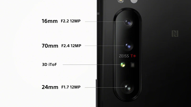 Xperia 1 II搭載最新研發的三鏡頭相機,三顆鏡頭皆為1200萬畫素,並由蔡司光學專屬調校,在鏡頭模組上新增「蔡司T* Coating增透及抗反射塗層鍍膜」,減少反射光線、抑制暈光及眩光,提升影像品質。